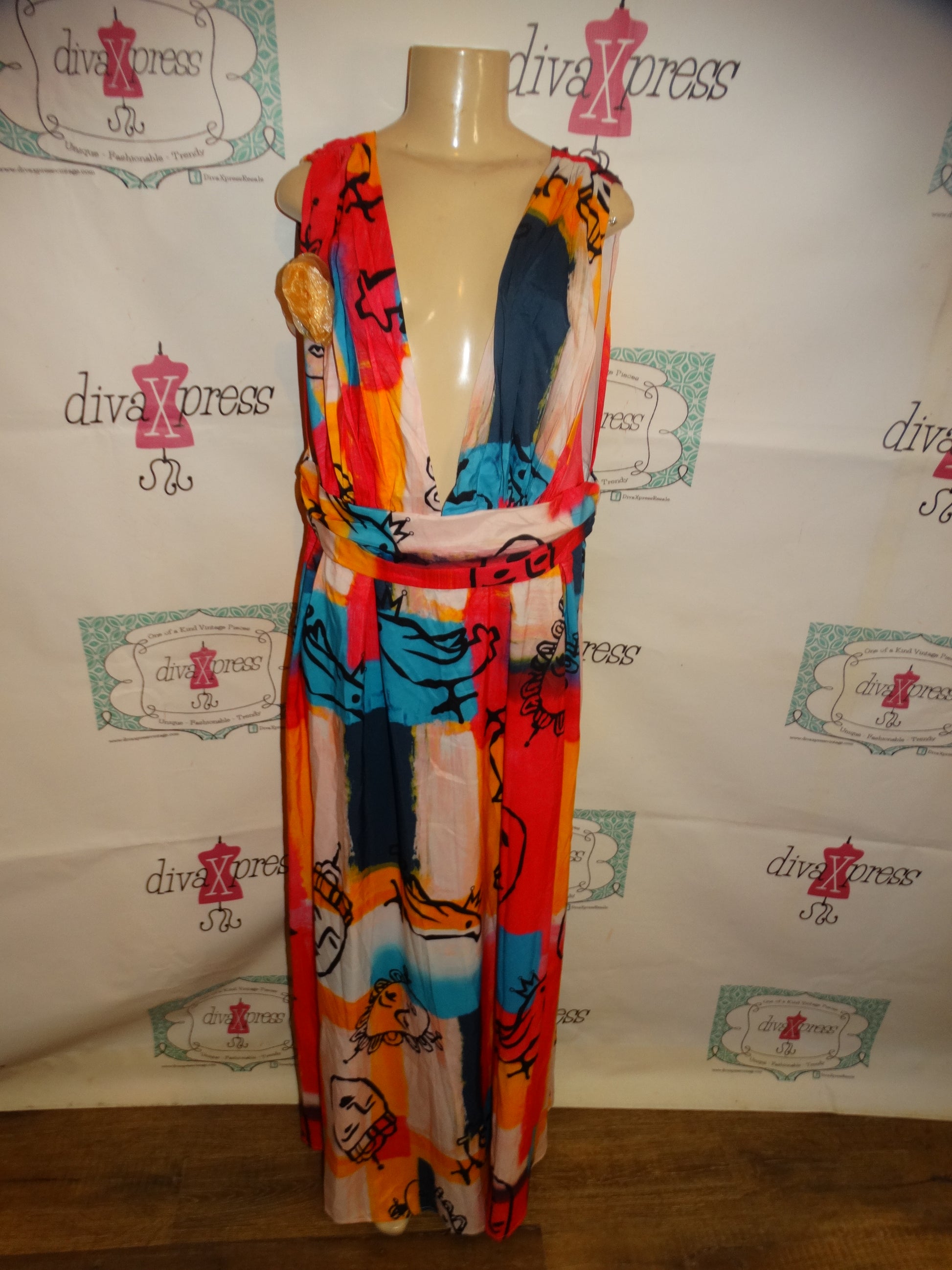 Up for sale is this lovely Pink Colorful Face Low Cut Dress Size 1x