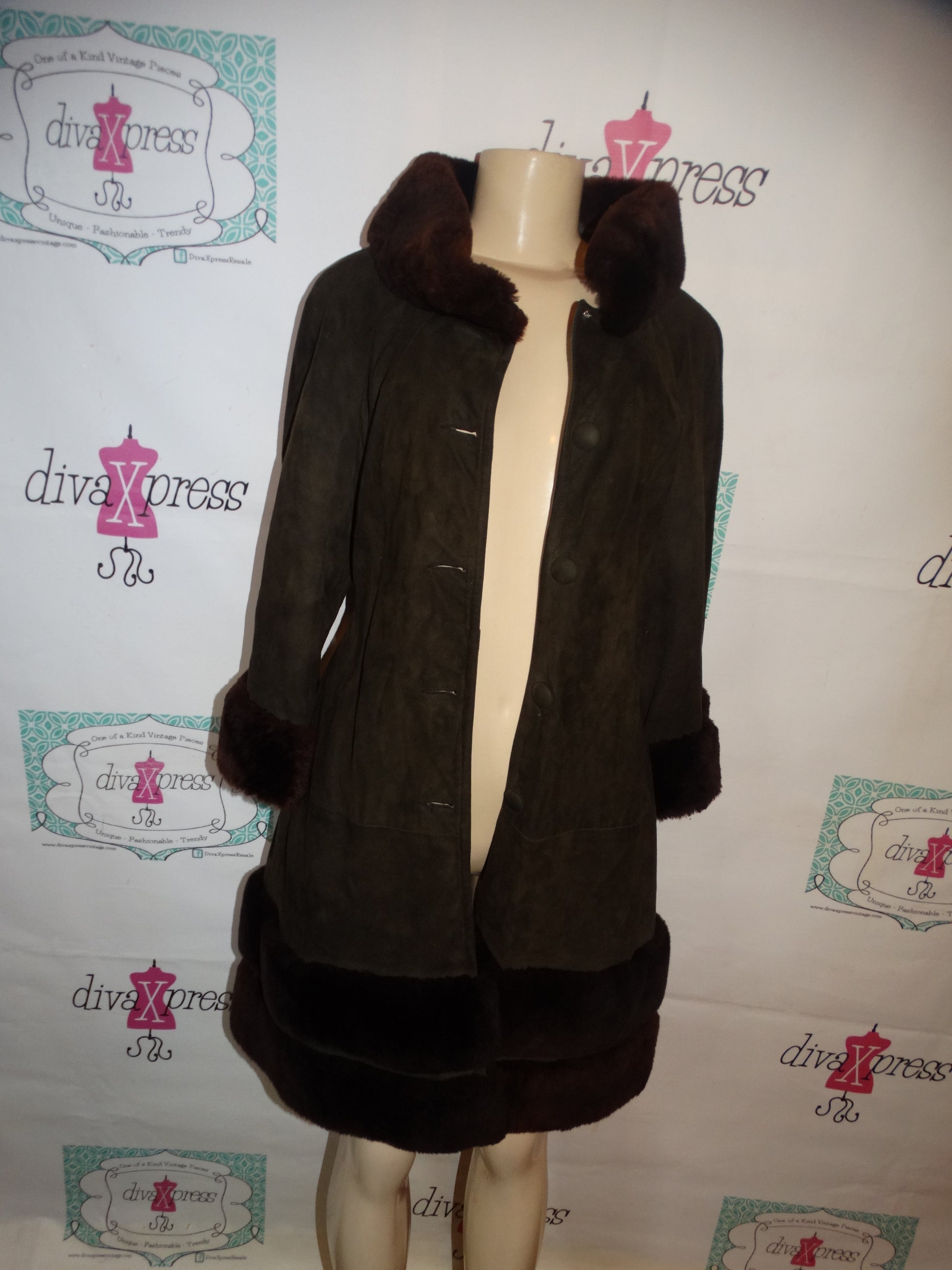 Vintage Green Suede Faux Fur Coat Size M
