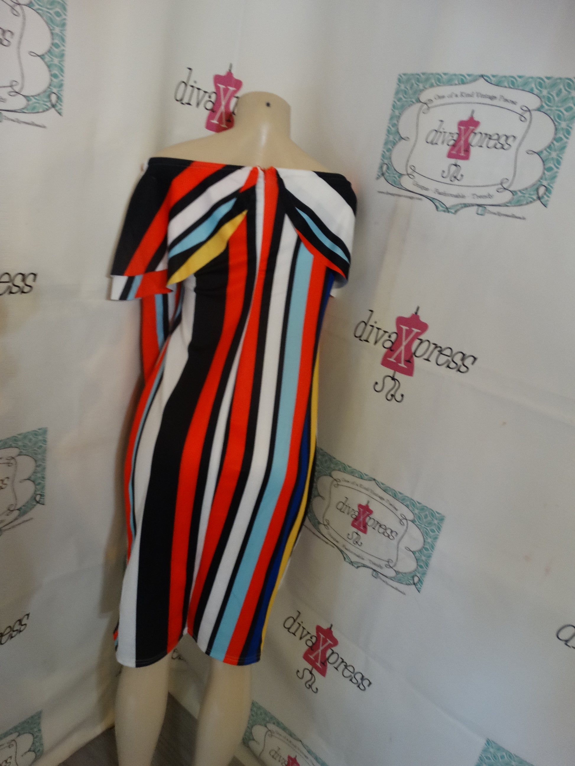 Up for sale is this lovely White Colorful Stripe Off Shoulder Dress Size L